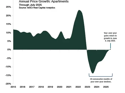 Multifamily valuations had declined roughly 19% since 2022, or over 26% when adjusted for inflation. By mid-2025, according to Real Capital Analytics those values have finally returned to positive territory. This marked the end of 29 consecutive months of year-over-year losses.